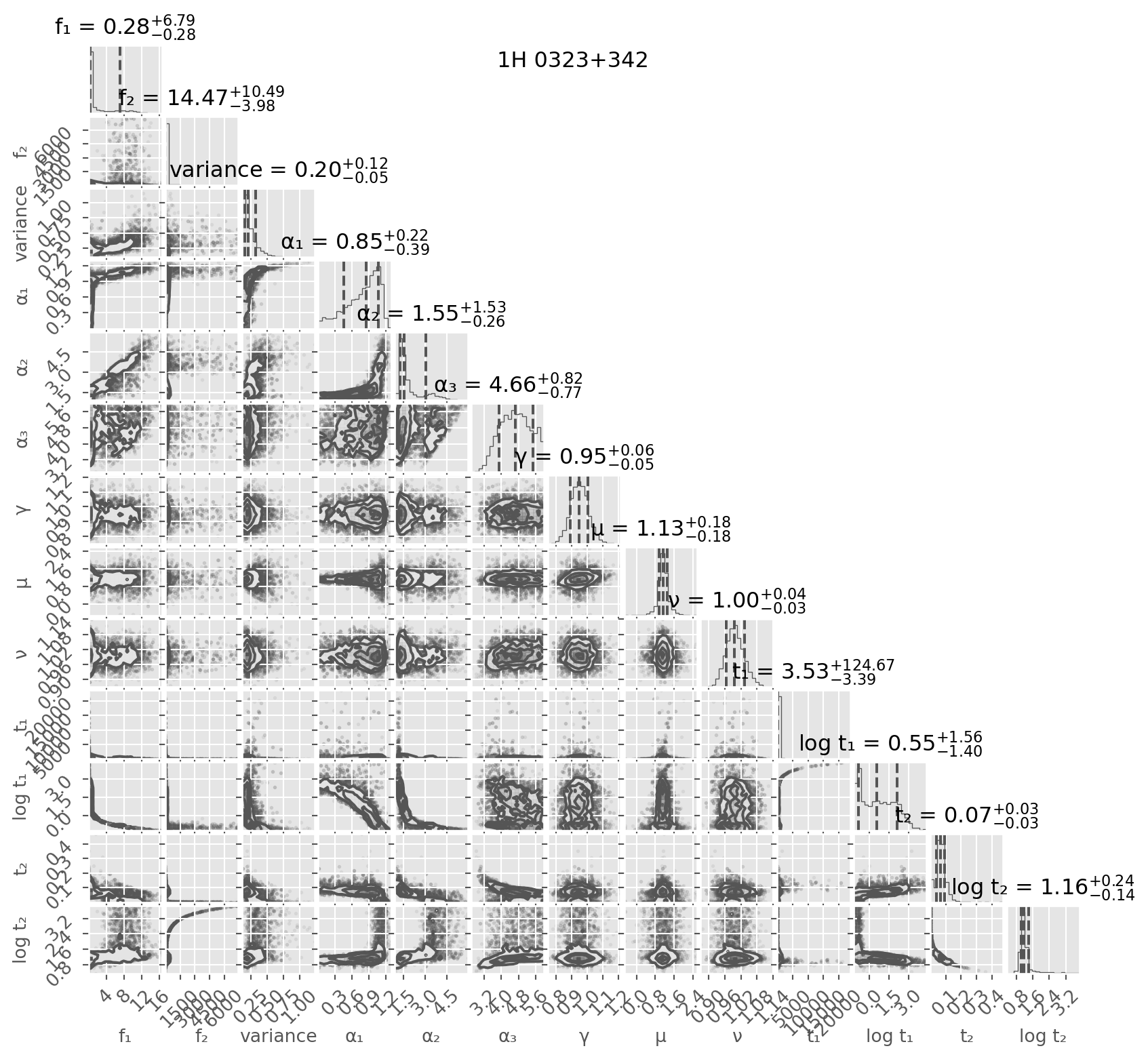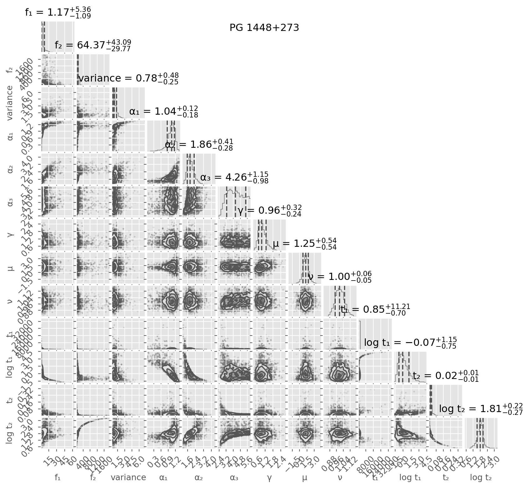 fig = corner.corner(inference_data_double[source], quantiles=[0.16, 0.5, 0.84], show_titles=True, title_kwargs={"fontsize": 12},label_kwargs={"fontsize": 10},labelpad=0.5,quiet=True)